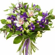 Букет «Чародейка» невероятно яркий и энергичный. В нем гармонично сочетаются белые изящные орхидеи, яркие насыщенные фиолетовые ирисы и нежные утонченные альстромерии. Особую пикантность композиции придает декор из красочной ленты без использования каких-либо оберток. С помощью такого букета вы сможете поднять настроение, подарить заряд бодрости и энергии на весь день, а также получить прощение дорогого человека, ведь смотря на такую яркую и выразительную цветочную композицию невозможно испытывать негативные эмоции.